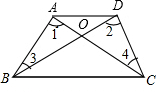 ∴∠1+∠CAD=∠2+∠BDA,∠3+∠OBC=∠4+∠OCB,即∠BAD=∠CDA,∠ABC=∠BCD,
