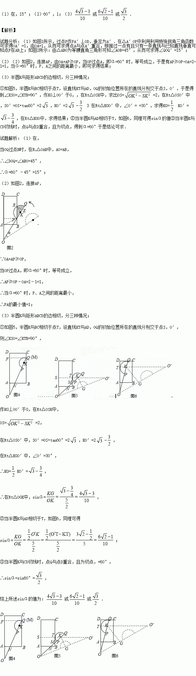 平面上,矩形ABCD与直径为QP的半圆K如图摆放,分别延长DA和QP交于点O,且∠DOQ=60°,OQ=OD=3,OP=2,OA=AB=1,让线段OD及矩形ABCD位置固定,将线段OQ连带着半圆K一起绕着点O按逆时针方向开始旋转,设旋转角为α(0°≤α≤60°).