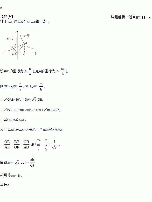 如图,在平面直角坐标系中,∠AOB=90°,∠OAB=30°,反比例函数y1=