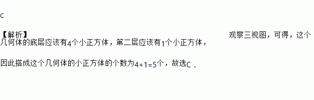 C 【解析】观察三视图,可得,这个几何体的底层应该有4个小正方体,第二层应该有1个小正方体, 因此搭成这个几何体的小正方体的个数为4+1=5个,故选C.