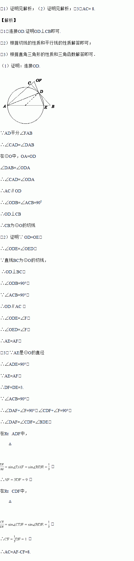 如图,在△ABC中,∠ACB=90°,O是AB上一点,以OA为半径的⊙O与BC相交于点D,与AB交于点E,AD平分∠FAB,连接ED并延长交AC的延长线于点F.