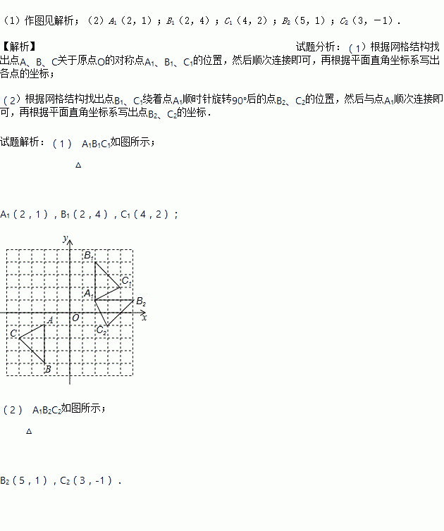 (1)以原点O为对称中心作△ABC的中心对称图形,得到△A1B1C1,请画出△A1B1C1,并直接写出A1、B1、C1的坐标;