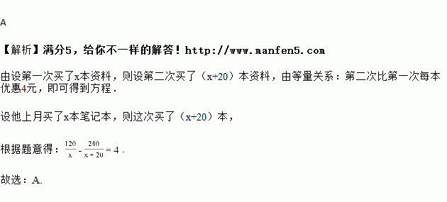 某美术社团为练习素描,他们第一次用120元买了若干本相同的画册,第二次用240元在同一家商店买与上一次相同的画册,这次商家每本优惠4元,结果比上次多买了20本.求第一次买了多少本画册?设第一次买了x本画册,列方程正确的是( )