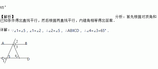 如图,已知∠1=∠2,∠3=65°,则∠4=____________ .