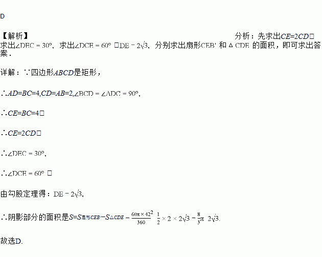 如图,将矩形ABCD绕点C沿顺时针方向旋转90°到矩形A′B′CD′的位置时,若AB=2,AD=4,则阴影部分的面积为( )