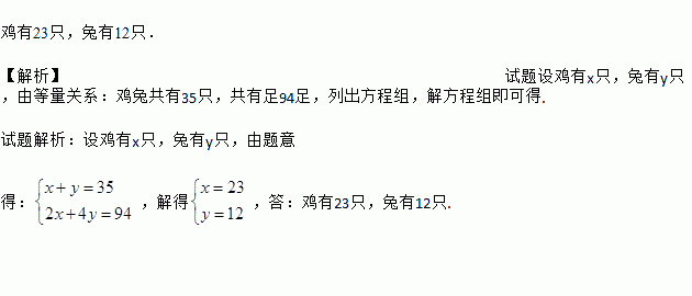 我国古代数学著作《孙子算经》中有“鸡兔同笼”问题:“今有鸡兔同笼,上有三十五头,下有九十四足.问鸡兔各几何.”其大意是:“有若干只鸡和兔关在同一笼子里,它们一共有35个头,94条腿.问笼中的鸡和兔各有多少只?”试用列方程(组)解应用题的方法求出问题的解.