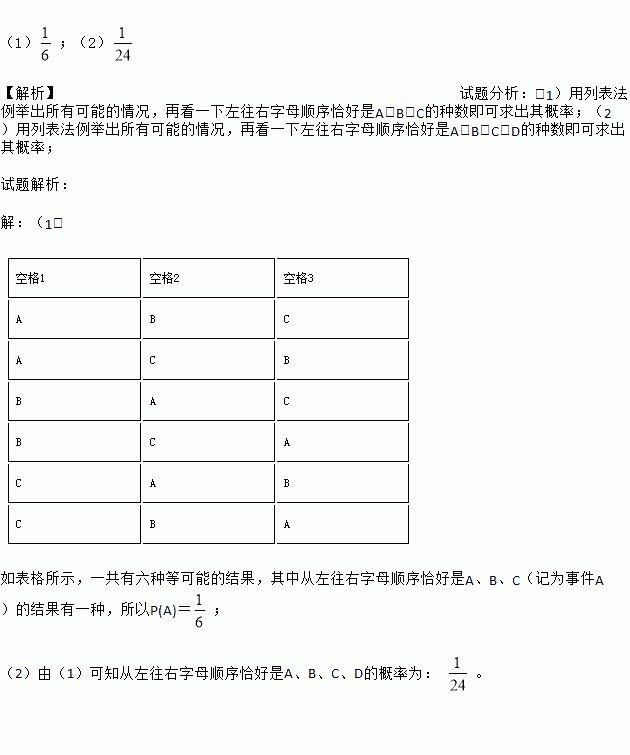 (2)若在如图三个空格的右侧增加一个空格,将A、B、C、D四个字母任意填写其中(每空填一个字母,每空中的字母不重复),从左往右字母顺序恰好是A、B、C、D的概率为 .