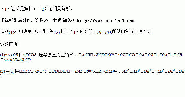 如图,△ABC和△ECD都是等腰直角三角形,∠ACB=∠DCE=90°,D为AB边上一点,求证:(1)△ACE≌△BCD;(2)AD2+AE2=DE2.