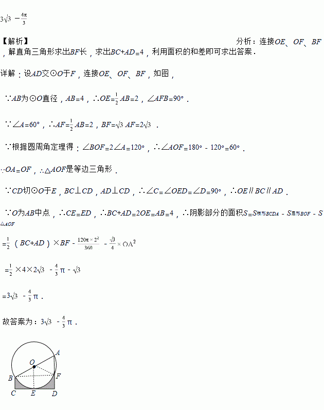 如图,AB是⊙O直径,CD切⊙O于E,BC⊥CD,AD⊥CD交⊙O于F,∠A=60°,AB=4,则阴影部分面积_______.
