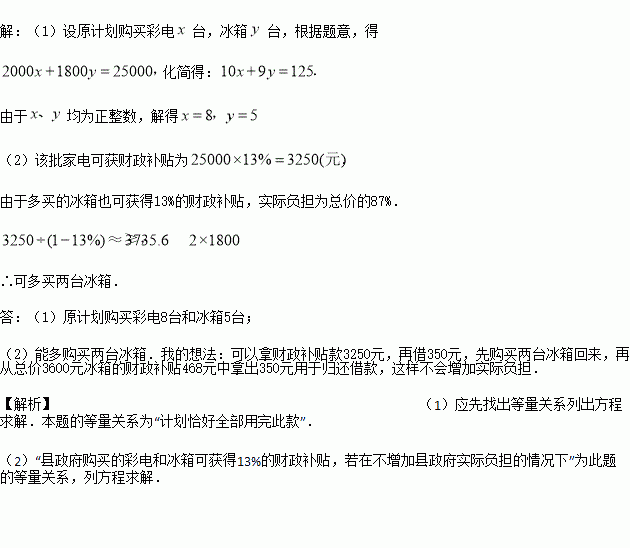 (2)由于国家出台“家电下乡”惠农政策,该县政府购买的彩电和冰箱可获得13%的财政补贴,若在不增加县政府实际负担的情况下,能否多购买两台冰箱?谈谈你的想法.