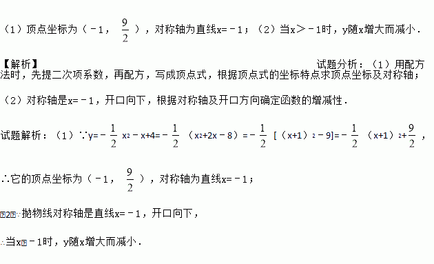 (1)顶点坐标为(﹣1, ),对称轴为直线x=﹣1;(2)当x>﹣1时,y随x增大而减小. 【解析】试题分析:(1)用配方法时,先提二次项系数,再配方,写成顶点式,根据顶点式的坐标特点求顶点坐标及对称轴; (2)对称轴是x=﹣1,开口向下,根据对称轴及开口方向确定函数的增减性. 试题解析:(1)∵y=﹣x2﹣x+4=﹣(x2+2x﹣8)=﹣ [(x+1)2﹣9]=﹣(x+1)2+...