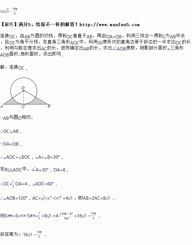 如图,已知在中,,,与相切于点,则图中阴影部分的面积为________.(结果保留)