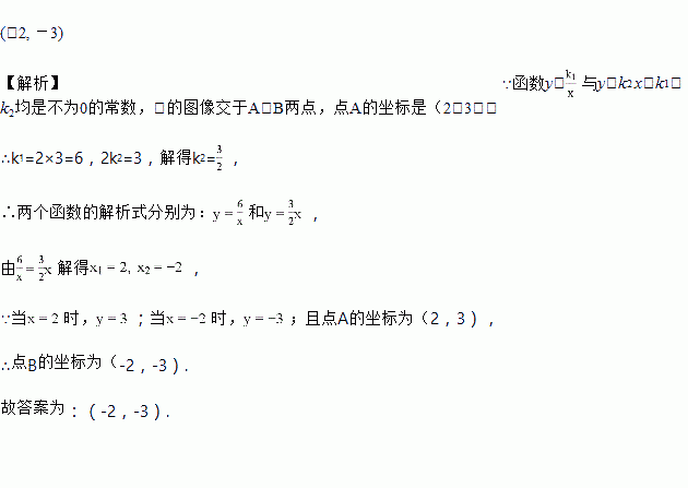 函数y=与y=k2 x(k1、k2均是不为0的常数,)的图像交于A、B两点,若点A的坐标是(2,3),则点B的坐标是_________.