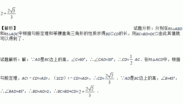 如图,在中,AD是BC边上的高, ,求BC的长结果保留根号
