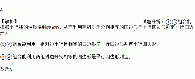 在四边形ABCD中,若有下列四个条件:①AB//CD;②AD=BC;③∠A=∠C;④AB=CD,现以其中的两个条件为一组,能判定四边形ABCD是平行四边形的条件有 ( )