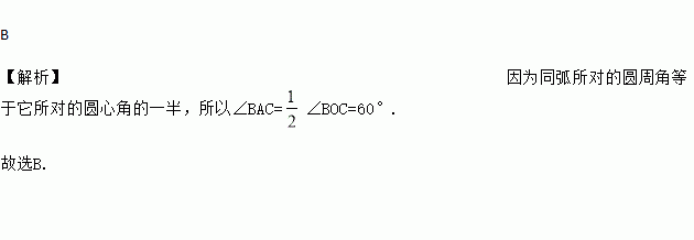 B 【解析】因为同弧所对的圆周角等于它所对的圆心角的一半,所以∠BAC=∠BOC=60°. 故选B.