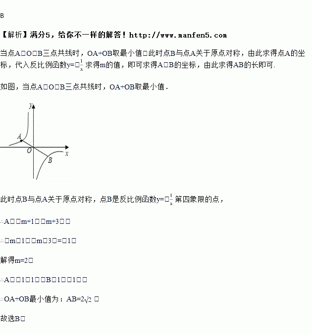 如图,在平面直角坐标系中,点A是反比例函数y=﹣第二象限的点,点B(m﹣1,m﹣3),则OA+OB最小值是( )