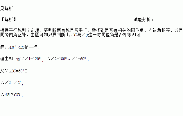 已知:如图,∠1=120°,∠C=60°,判断AB与CD是否平行?为什么?