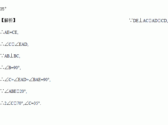 如图,在Rt△ABC中,AB⊥BC,DE⊥AC,AD=CD,∠BAE=20°,则∠C=___________.