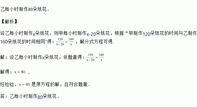 在校园手工制作活动中,现有甲、乙两人接到手工制作纸花任务,已知甲每小时制作纸花比乙每小时制作纸花少20朵,甲制作120朵纸花的时间与乙制作160朵纸花的时间相同,求乙每小时制作多少朵纸花?
