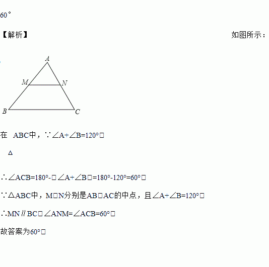 在ΔABC中,M、N分别是AB、AC的中点,且∠A +∠B=120°,则∠AN M=________。.