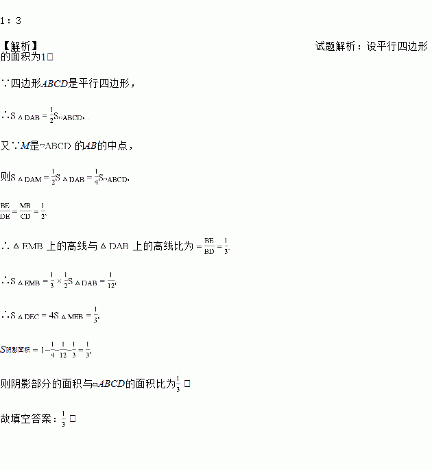 如图,M是?ABCD的AB的中点,CM交BD于E,则图中阴影部分的面积与?ABCD的面积之比为_____.