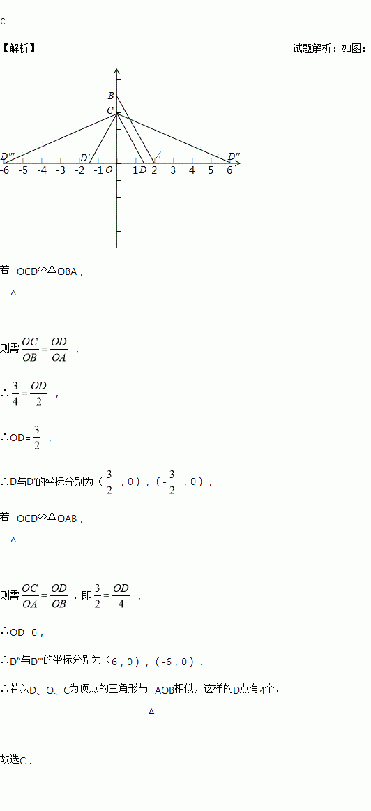 在直角坐标系中,已知O(0,0),A(2,0),B(0,4),C(0,3),D为x轴上一点.若 以D、O、C为顶点的三角形与△AOB相似,这样的D点有…( )