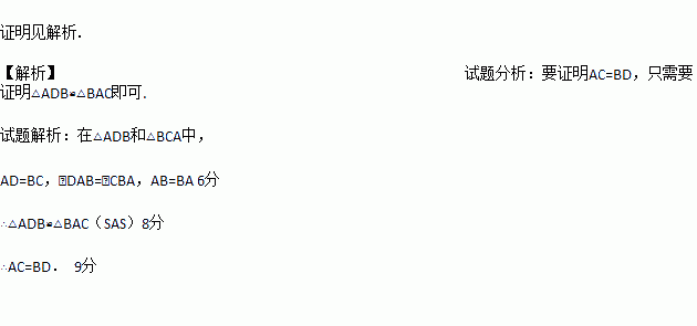 如图,在△ABC和△ABD中,AC与BD相交于点E,AD=BC,∠DAB=∠CBA,求证:AC=BD.