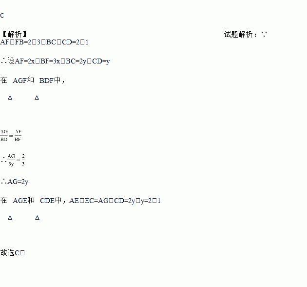 C 【解析】试题解析:∵AF:FB=2:3,BC:CD=2:1 ∴设AF=2x,BF=3x,BC=2y,CD=y 在△AGF和△BDF中, ∴ ∴AG=2y 在△AGE和△CDE中,AE:EC=AG:CD=2y:y=2:1 故选C.