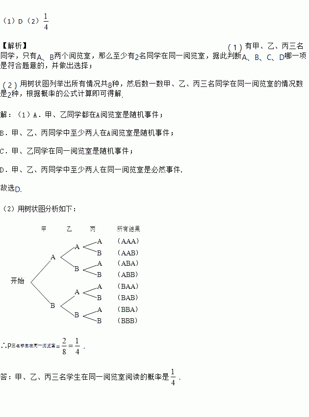(2)用画树状图的方法求甲、乙、丙三名学生在同一阅览室阅读的概率.