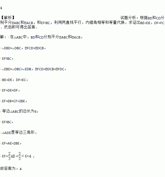 如图,等边△ABC的边长为6,∠ABC,∠ACB的角平分线交于点D,过点D作EF∥BC,交AB、CD于点E、F,则EF的长度为___________.