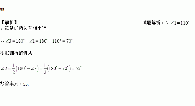 将一张长方形纸条折成如图所示的形状,若∠1=110°,则∠2=________度.