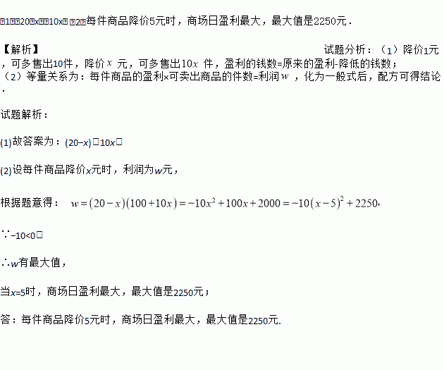 (1)(20﹣x),10x; (2)每件商品降价5元时,商场日盈利最大,最大值是2250元. 【解析】试题分析:(1)降价1元,可多售出10件,降价元,可多售出件,盈利的钱数=原来的盈利-降低的钱数; (2)等量关系为:每件商品的盈利×可卖出商品的件数=利润,化为一般式后,配方可得结论. 试题解析: (1)故答案为:(20?x),10x; (2)设每件商品降价x元时,利润...