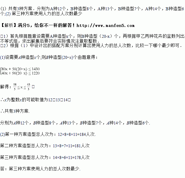 我市某县政府为了迎接“八一”建军节,加强军民共建活动,计划从花园里拿出1430盆甲种花卉和1220盆乙种花卉,搭配成A、B两种园艺造型共20个,在城区内摆放,以增加节日气氛,已知搭配A、B两种园艺造型各需甲、乙两种花卉数如表所示:(单位:盆)
