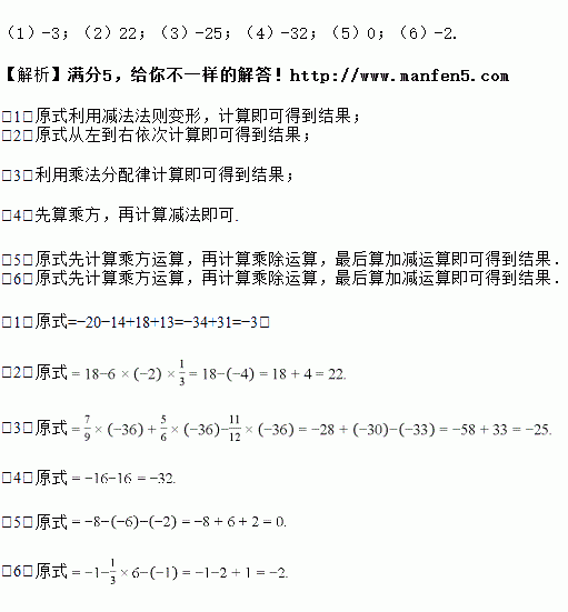计算:(1)-20+(-14)-(-18)+13 (2) 18-6(-)