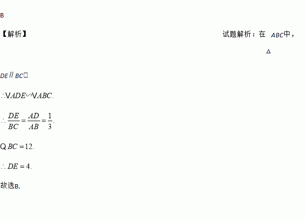 如图,在△ABC中,DE∥BC, ,BC=12,则DE的长是( )