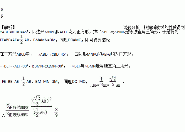 如图,在正方形ABCD中,点E,N,P,G分别在边AB,BC,CD,DA上,点M,F,Q都在对角线BD上,且四边形MNPQ和AEFG均为正方形,则的值等于 .