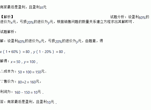 某商店有两个进价不同计算机都卖80元,其中一个盈利60%,另一个亏损20%,请你计算在这次买卖中这个商家是盈利还是亏损,盈利或者亏损多少?