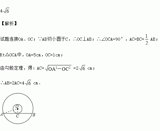 如图是一张电脑光盘的表面,两个圆的圆心都是点O,大圆的弦AB所在直线是小圆的切线,切点为C.已知大圆的半径为5cm,小圆的半径为1cm,则弦AB的长度为 cm.