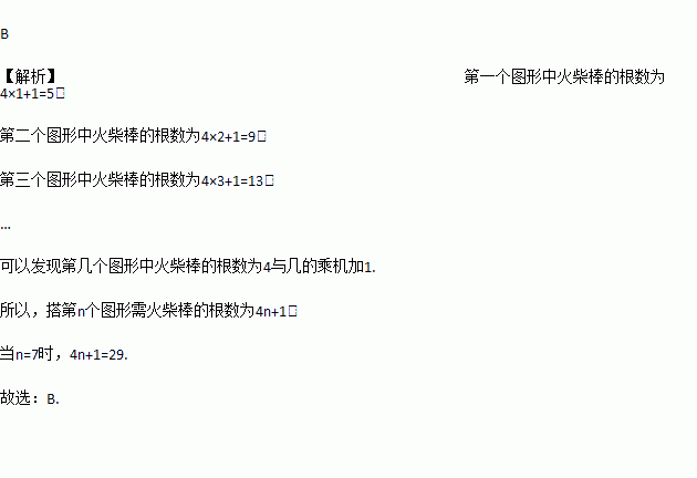 用火柴棒按下图中的方式搭图形,则搭第7个图形所需火柴棒的根数为 ( )