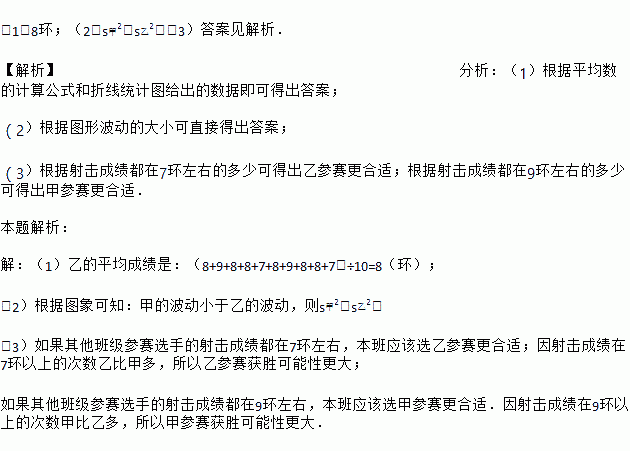 (1)8环;(2)s甲2>s乙2;(3)答案见解析. 【解析】分析:(1)根据平均数的计算公式和折线统计图给出的数据即可得出答案; (2)根据图形波动的大小可直接得出答案; (3)根据射击成绩都在7环左右的多少可得出乙参赛更合适;根据射击成绩都在9环左右的多少可得出甲参赛更合适. 本题解析: 【解析】 (1)乙的平均成绩是:(8+9+8+8+7+8+9+8+8+7)...