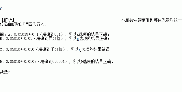 四舍五入法按要求对0.05019分别取近似值,其中错误的是( )
