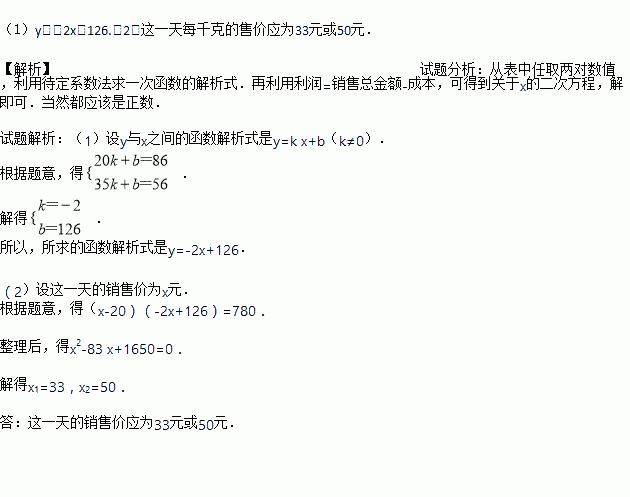 (2)如果这种土特产的成本价是20元/千克,为使某一天的利润为780元,那么这一天每千克的售价应为多少元?(利润=销售总金额-成本)
