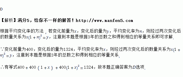 C. 400(1+x)+400(1+x)2=1324 D. 400+400(1+x)+400(1+x)2=1324