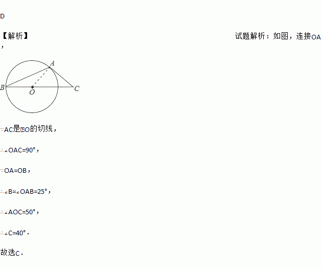如图,AB是⊙O的弦,AC是⊙O切线,A为切点,BC经过圆心.若∠B=20°,则∠C的大小等于( )
