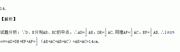 如图,在△ABC中,点D、E、F分别是边AB、BC、CA上的中点,且AB=6cm,AC=8cm,则四边形ADEF的周长等于 cm.