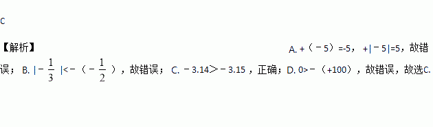 A. +(﹣5)=+|﹣5| B. |﹣|>﹣(﹣) C. ﹣3.14>﹣3.15 D. 0<﹣(+100)