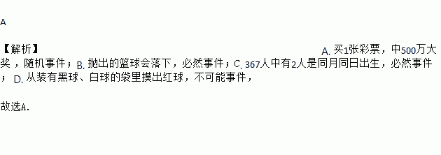 A 【解析】A. 买1张彩票,中500万大奖 ,随机事件;B. 抛出的篮球会落下,必然事件;C. 367人中有2人是同月同日出生,必然事件; D. 从装有黑球、白球的袋里摸出红球,不可能事件, 故选A.