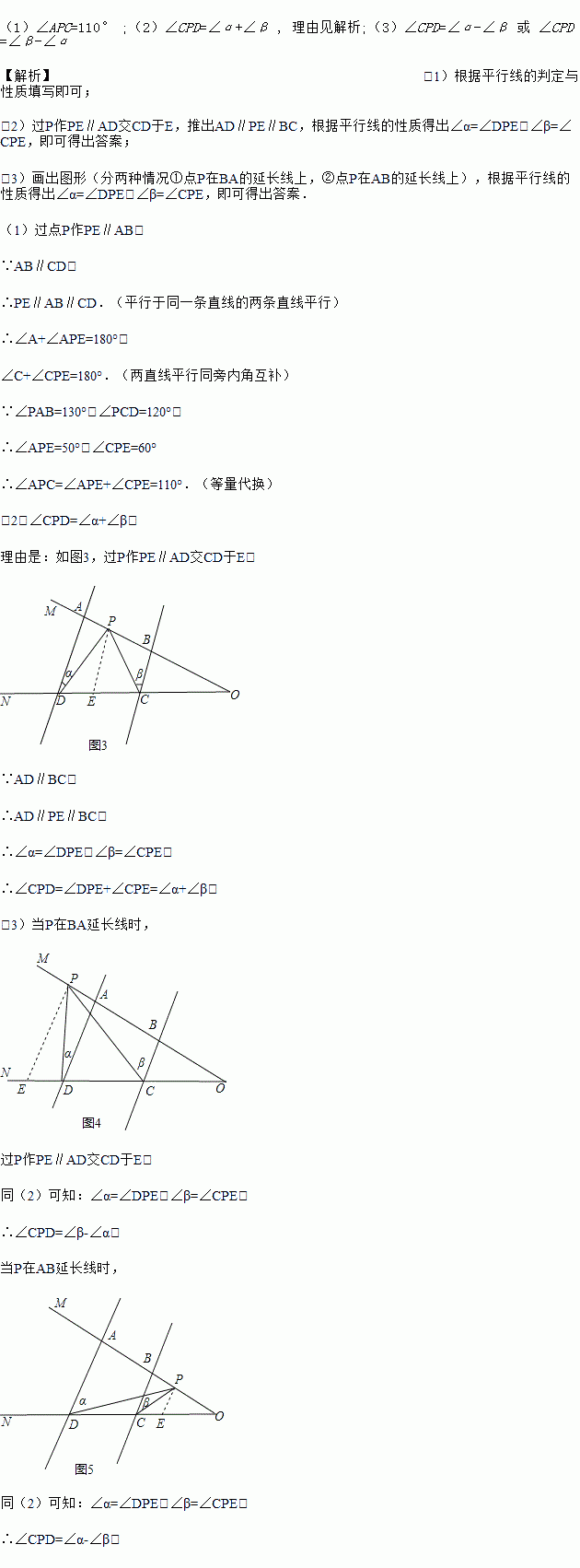 (2)如图3,AD∥BC,点P在射线OM上运动,当点P在A、B两点之间运动时,∠ADP=∠α,∠BCP=∠β.试判断∠CPD、∠α、∠β之间有何数量关系?