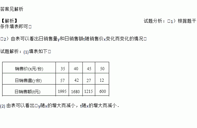 答案见解析 【解析】试题分析:(1)根据题干条件填表即可, (2)由表可以看出日销售量y和日销售额t随销售价x变化而变化的情况. 试题解析:(1)填表如下: (2) 由表可以看出:y随x的增大而减小,t随x的增大而减小.
